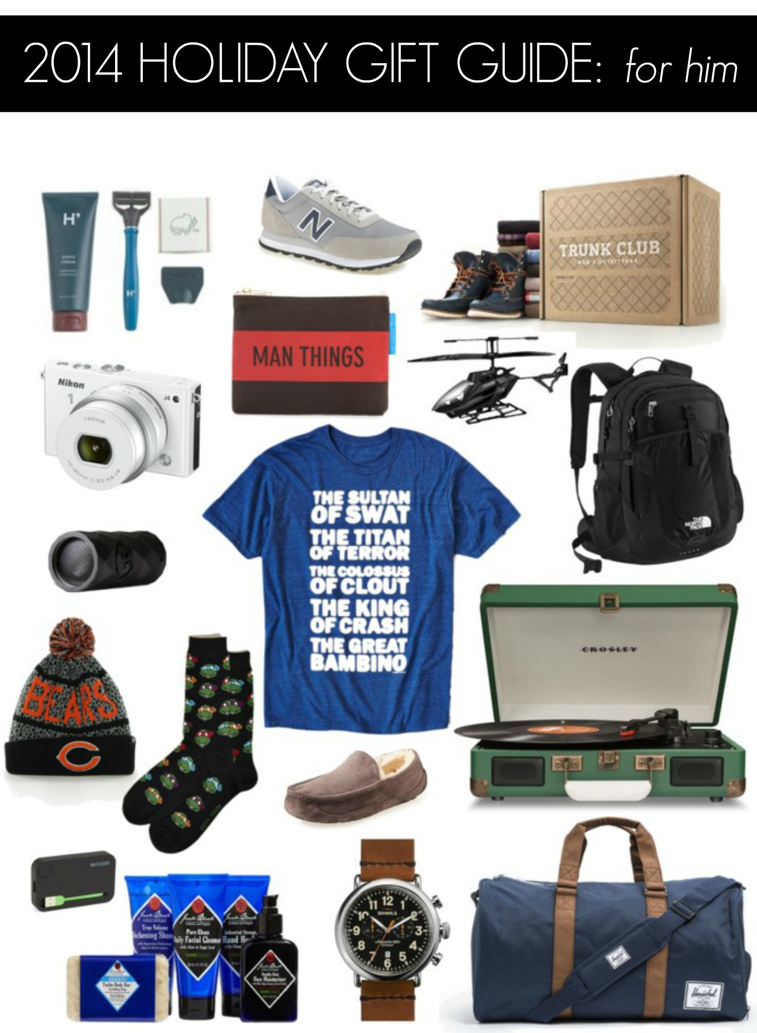 If you're trying to splurge on him or really spoil him, try a classic chronograph watch or digital camera with wifi. For the stylish or plain clueless man, a gift card to Trunk Club is an extra handy gift. For the guy on the go, a great weekend bag, functional backpack, and this funny pouch will send him off in style. Got a guy that likes to take of himself? Try these Jack Black products (a boyfriend favorite) and a shave kit from Harry's. Is he into things he can wear? Try a great team logo toboggan, novelty socks, great slippers, throwback kicks, or my personal favorite a tee commemorating a favorite childhood movie. If he's all about gadgets a portable speaker, charger, record player, or remote control helicopter are all sure to please. And yes all adult men love those freaking remote controlled helicopters.